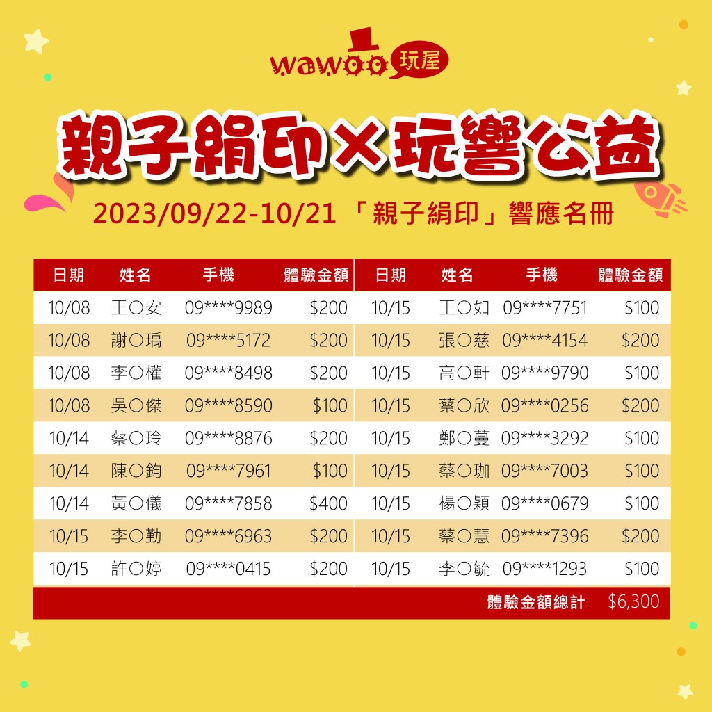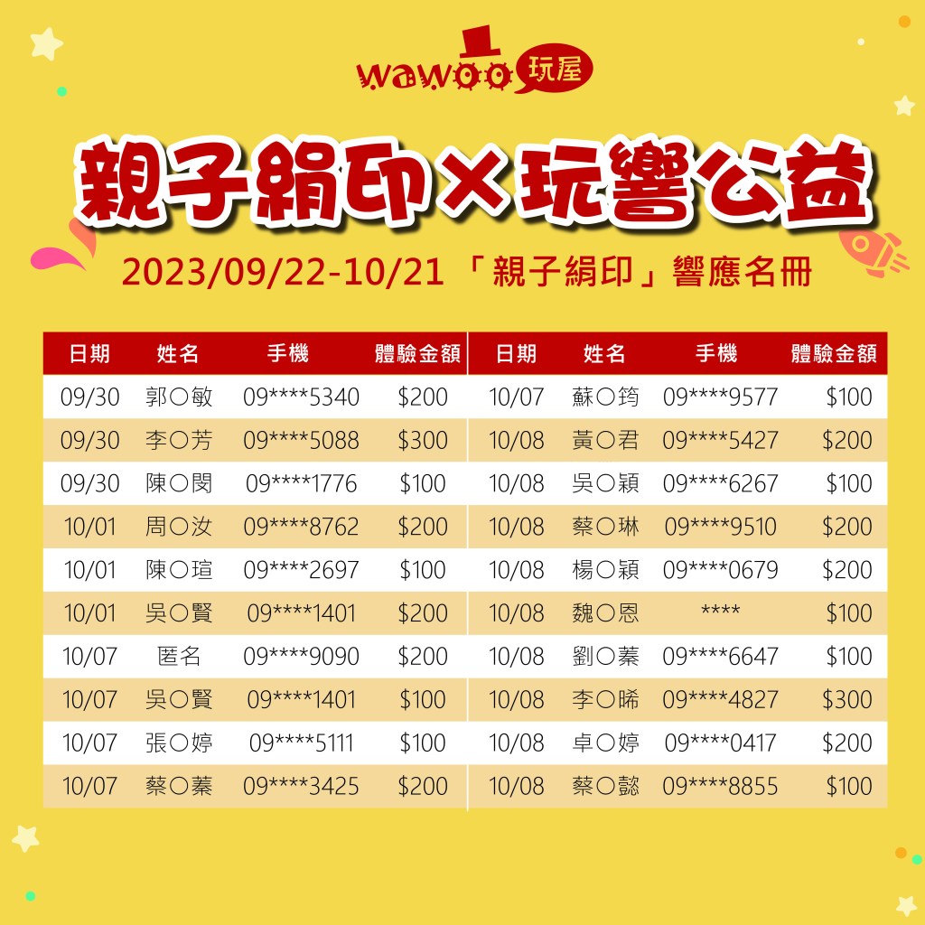 2023/09/22~10/21「玩屋親子絹印x玩響公益」體驗響應名冊: